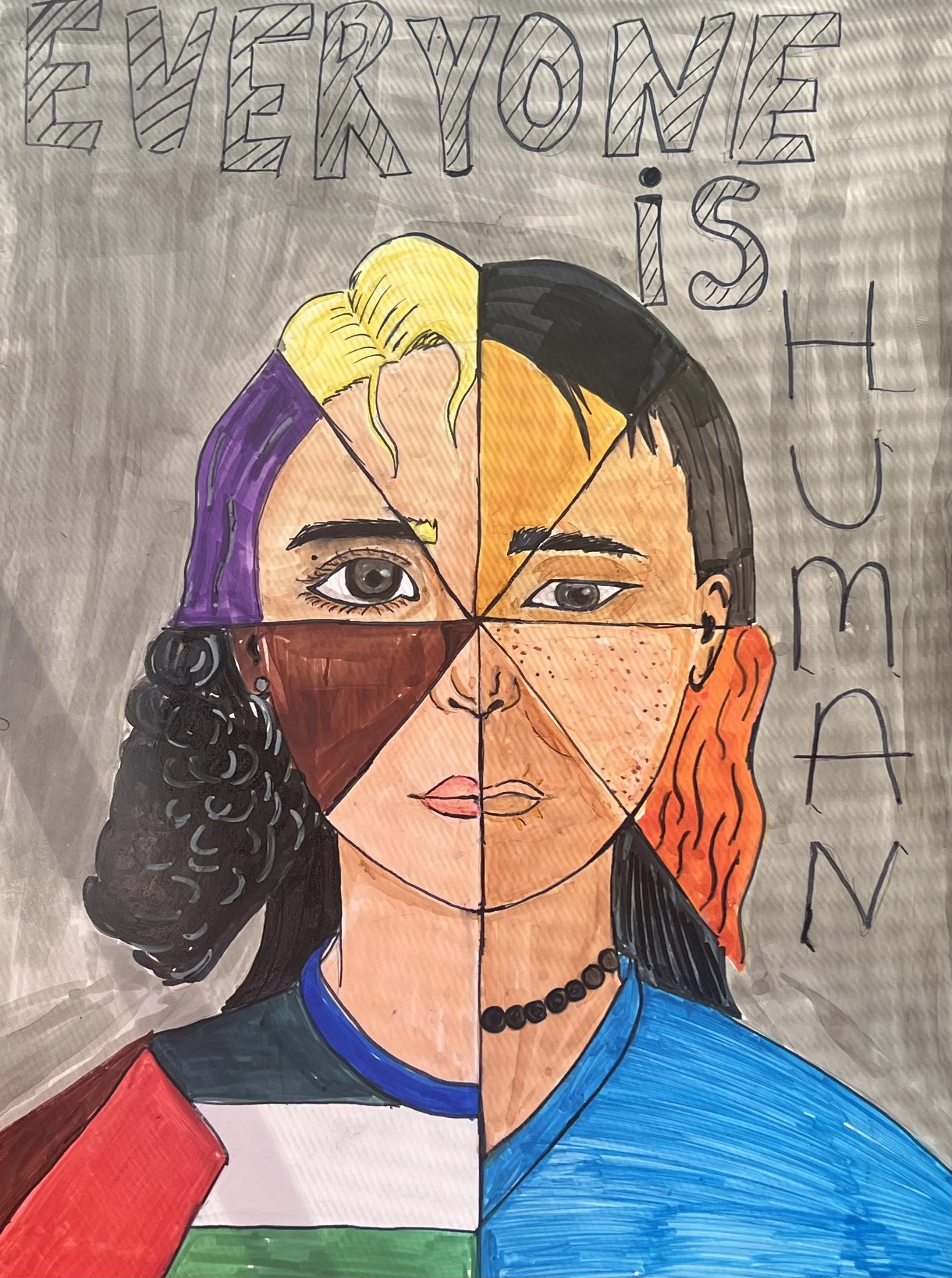 My entry empowers justice by visually declaring that every person, regardless of skin tone, hair texture, or background, is equally human. Furthermore, by dividing the face into diverse segments and uniting them into one whole, I'm showing that differences should be embraced, not used to divide. Moreover, my bold message “EVERYONE is HUMAN” challenges people to confront bias and recognize shared humanity.