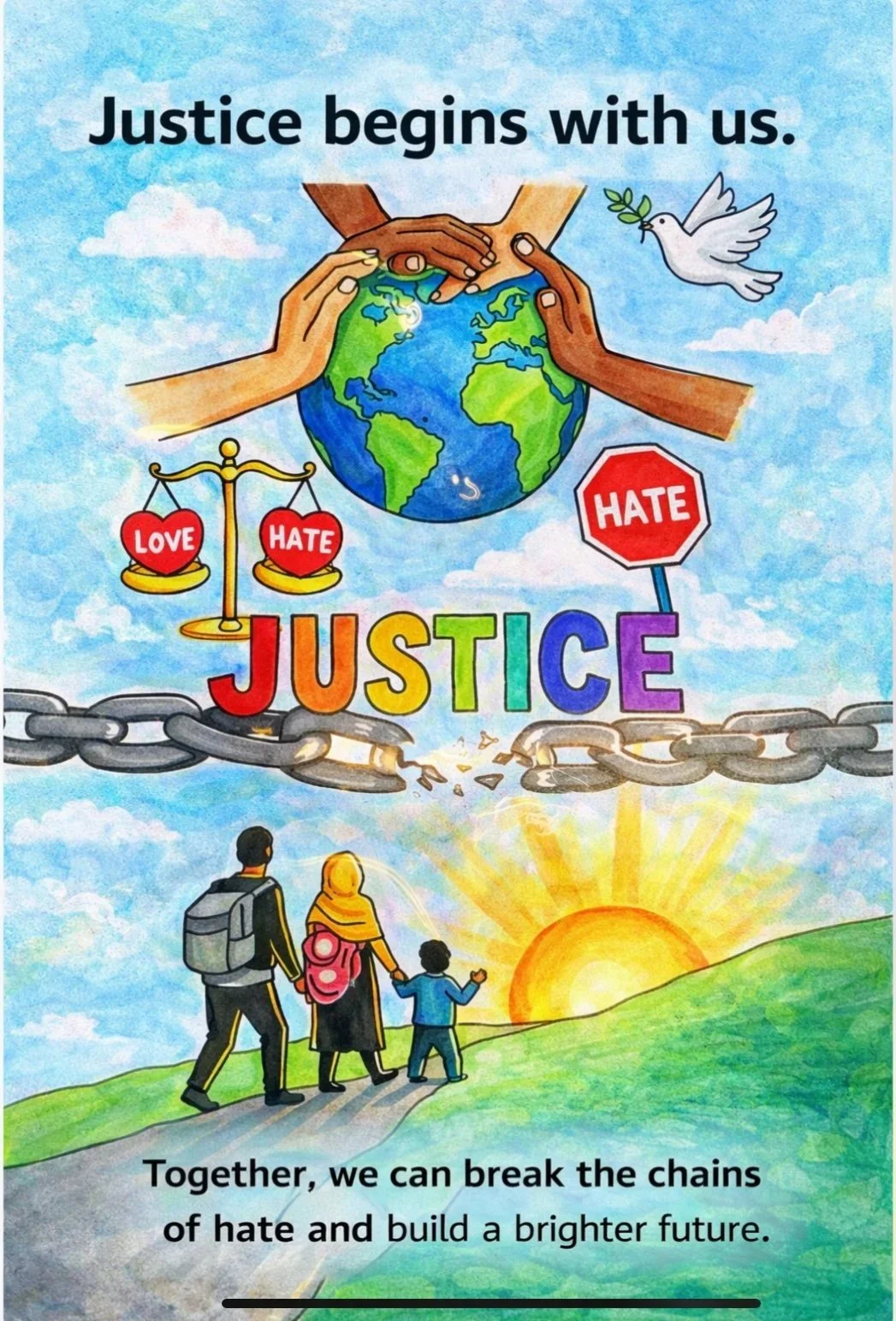 The hands holding the Earth represent people from different backgrounds working together and sharing responsibility. The scale shows that love must outweigh hate, and the stop sign sends a strong message that hate should not be accepted. The broken chains symbolize breaking free from injustice and discrimination. Finally, the family walking toward the sunrise represents hope, safety, and equal opportunity for everyone.Together, these symbols encourage people to choose fairness, kindness, and unity, which empowers justice in our world.