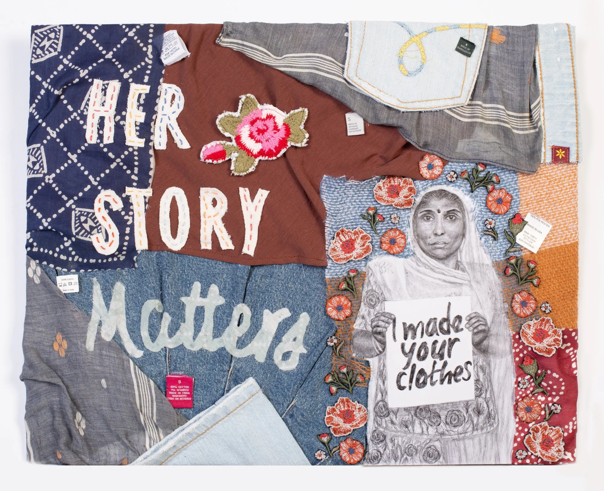 The background is made entirely of repurposed clothes to show the power of reusing fabrics for good. I randomly placed the tags, which are commonly found on the inside of clothes, describing where they are made throughout the piece. This further shows the connection between the places and the stories found in every garment. The words hand-stitched into this mixed media piece convey that her story is both literally and figuratively stitched into every garment she creates. The reality is: There is a maker behind every stitch, every cut, and every garment. That’s why … Her Story Matters!