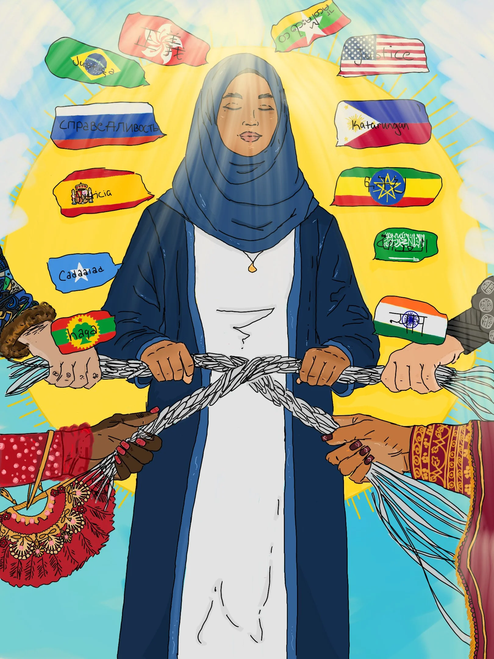 This artwork of mine shows justice as something shared across the world, and yet it's not given to many. At the center a calm figure holds the rope, steadily as many hands pull from different directions, each of them from different places, reaching for the same thing. Justice. This rope, which can also be seen, represents justice under repetitive strain. Stretched by inequality, power, poverty, and even conflict.
